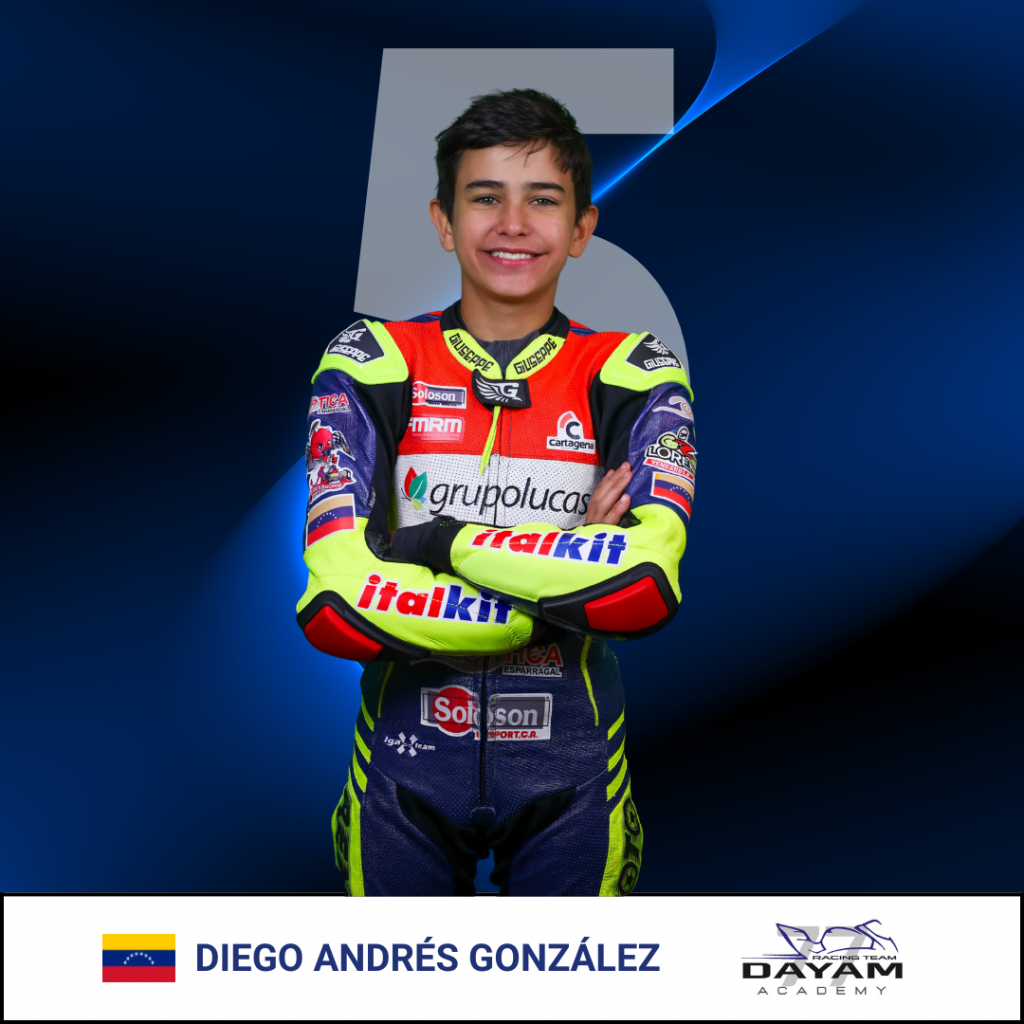 Diego Andrés González, piloto venezolano, cuenta con un destacado recorrido en categorías base. Ha sido 4 veces campeón en Minimotos y obtuvo el tercer puesto en MiniGP 110 en 2023. En 2024 se coronó campeón de la FIM MiniGP Latin America Series y logró el tercer puesto en la Final Mundial de la FIM MiniGP World Series 160.